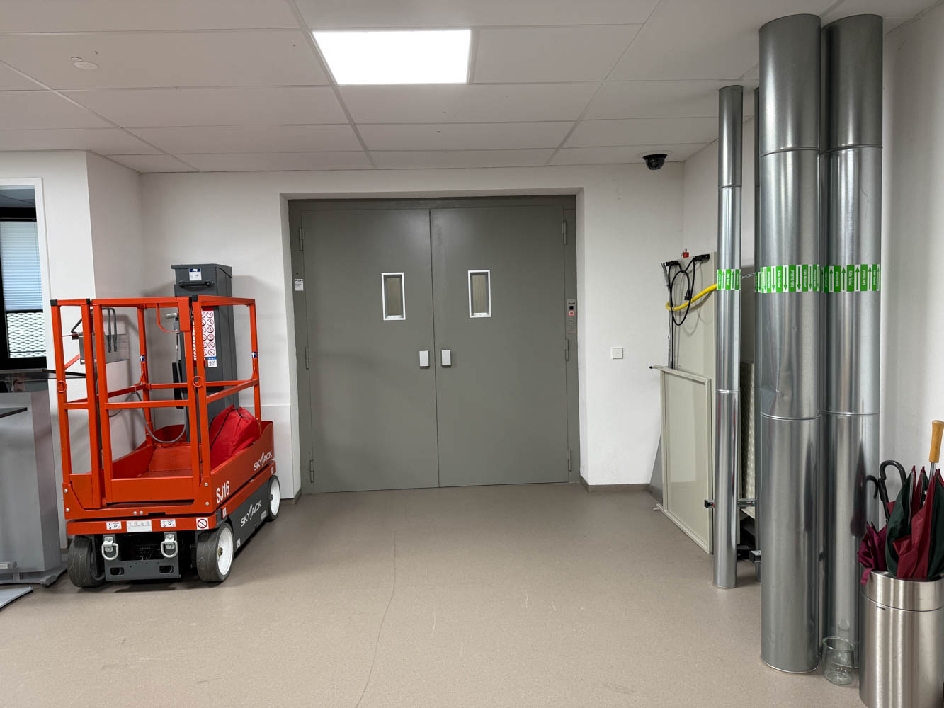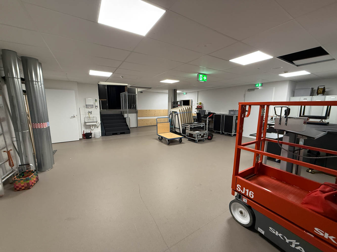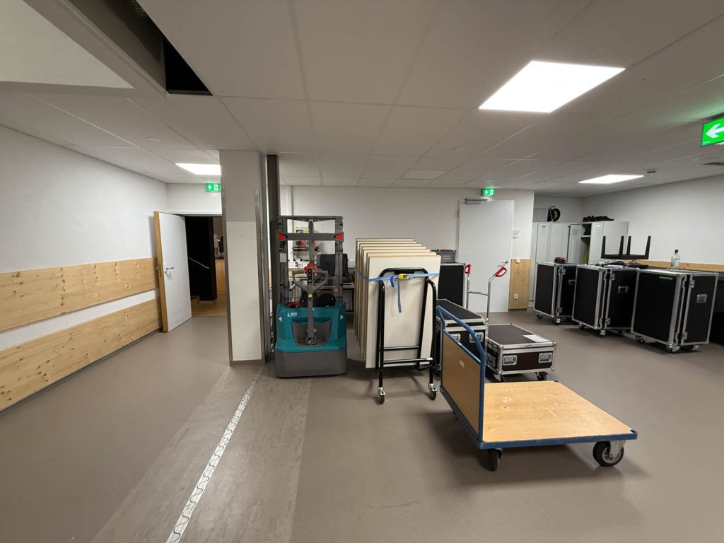 Lastenaufzug von Außen und Bereich hinter der Bühne